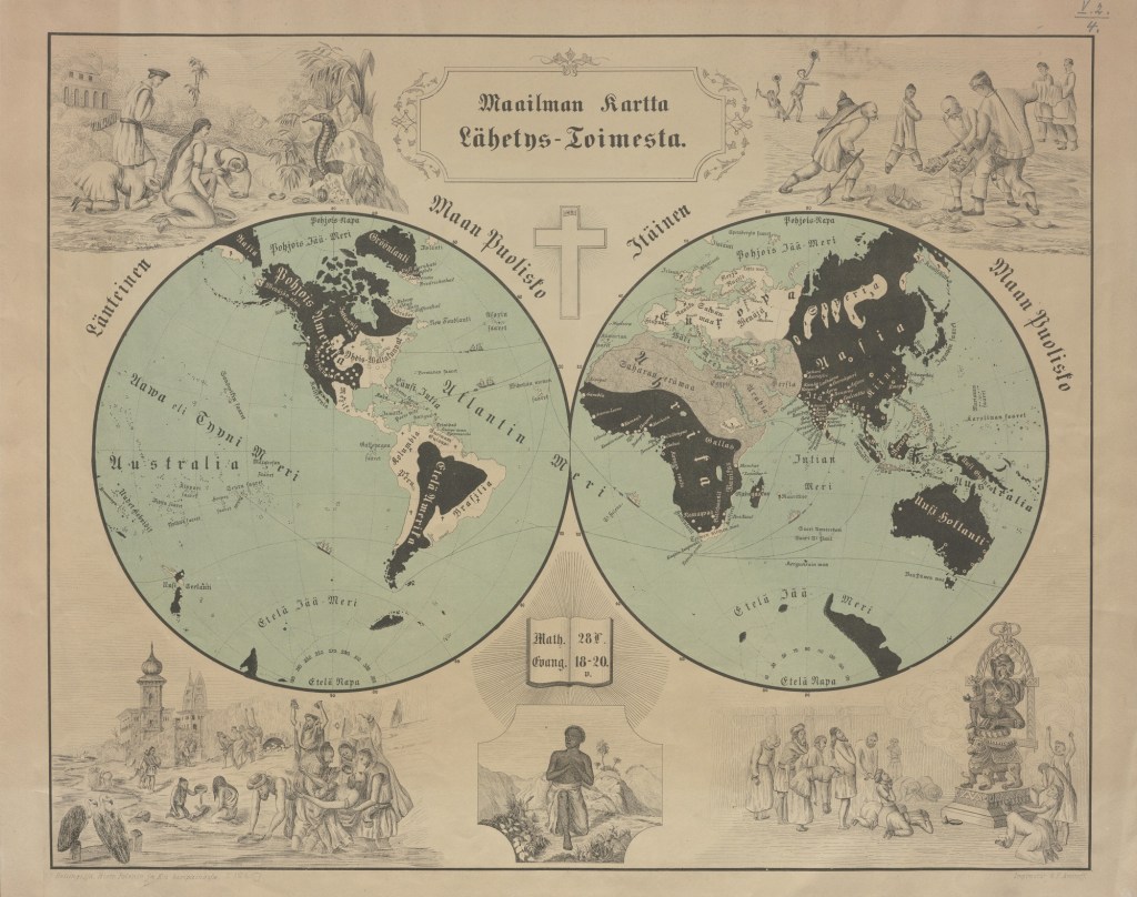 Maailman kartta Lähetys-toimesta, Suomen Lähetysseura, n. 1860, kuva: Suomen Kansalliskirjasto. Kartan laitoja koristavat kuvitukset esittävät stereotyyppisiä kuvia eri maantieteellisten alueiden asukkaista ja heidän uskonnollisista käytännöistään. Tällaiset kuvitukset olivat tyypillisiä lähetyskartoissa ja niiden tarkoituksena oli ruokkia katsojiensa, tässä tapauksessa suomalaisten, huolta “kaukaisista toisista”. Samalla ne välittivät rodullistettua, rasistista tietoa ihmisten välisistä eroista.